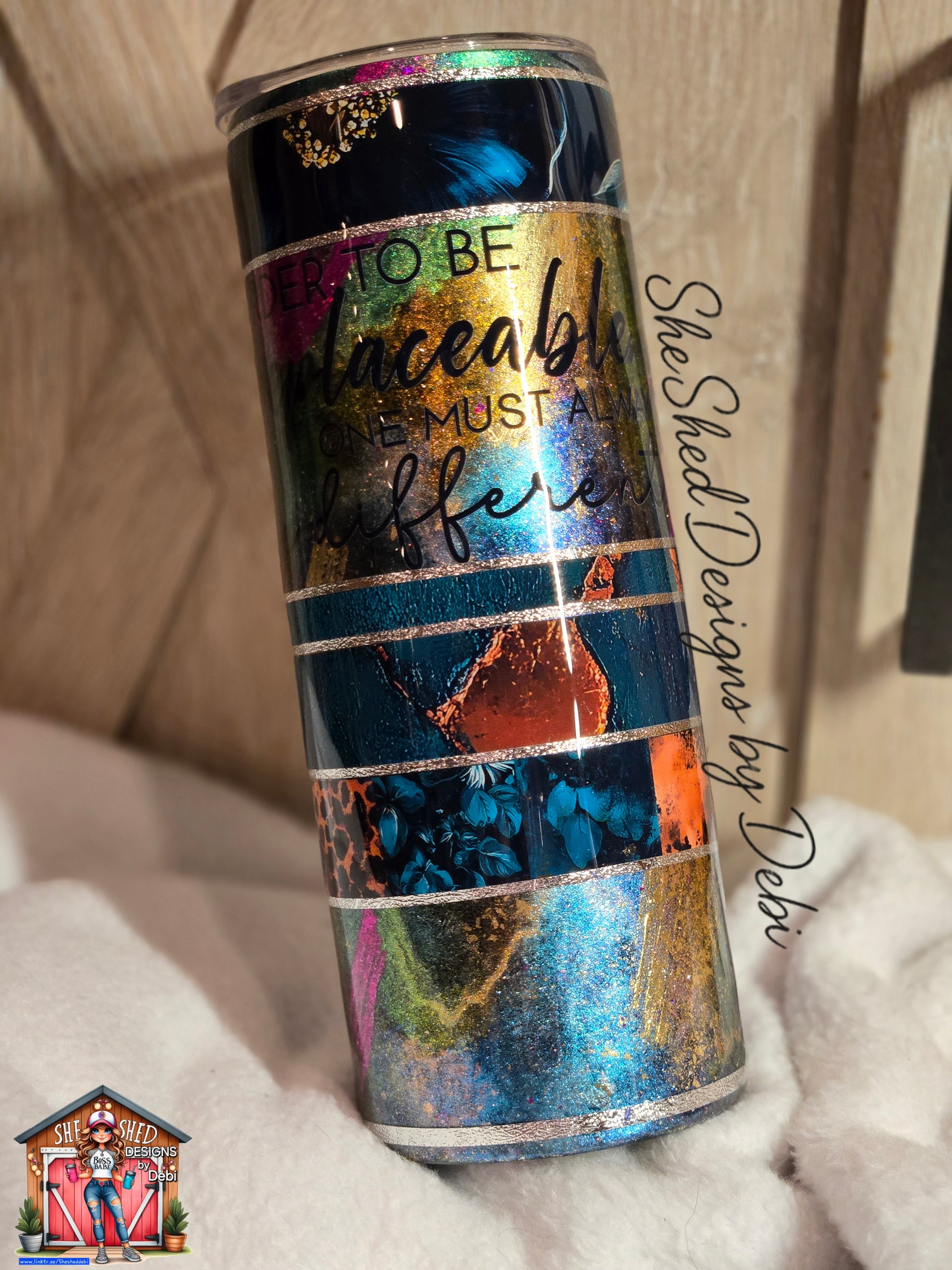 Bold individuality meets artistic expression in this 20 oz stainless steel tumbler, designed for those who refuse to blend in. Featuring the quote “In order to be irreplaceable, one must be different,” this tumbler combines rich color shifts, metallic accents, and layered textures that change beautifully in the light.